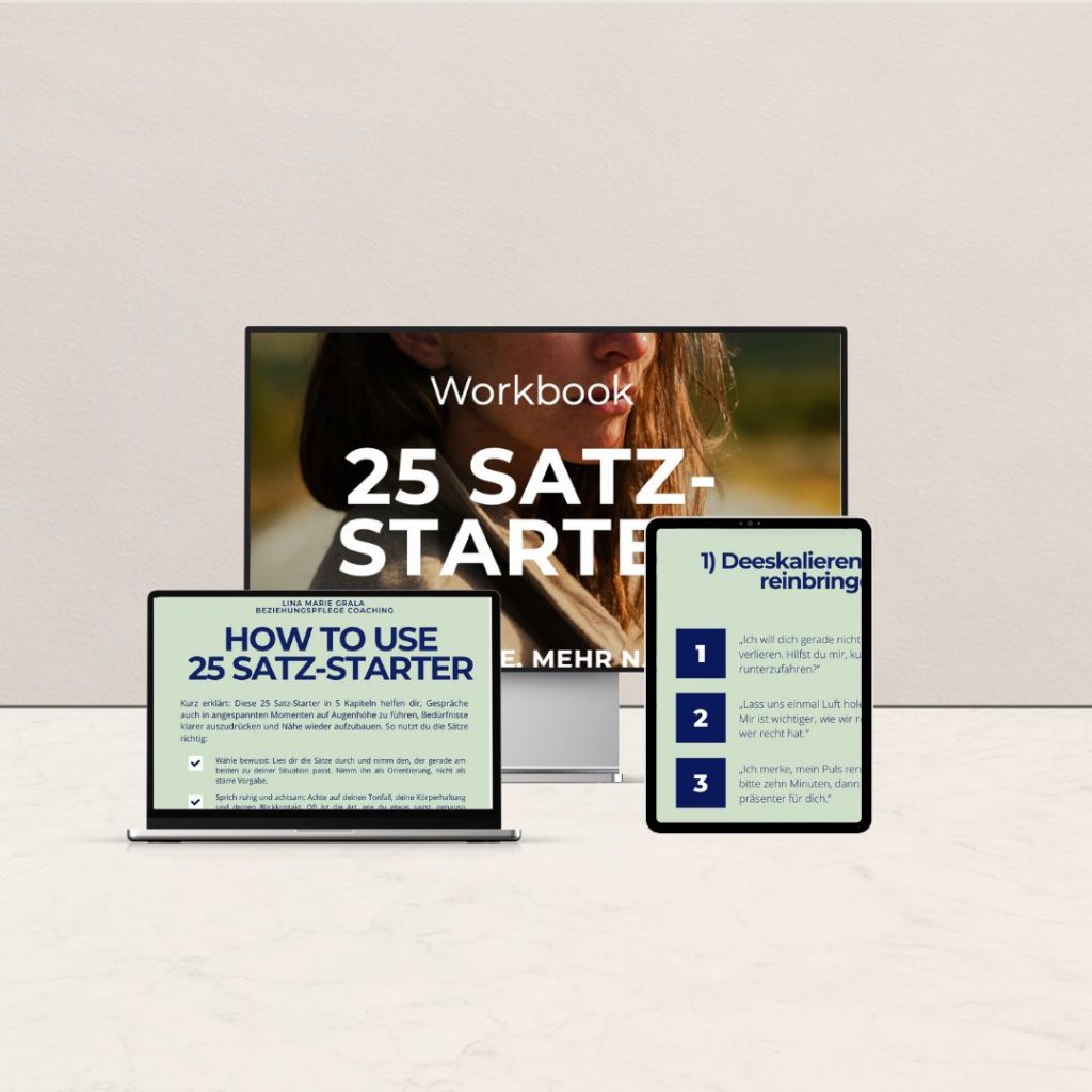 Kennst du das Gefühl, dass Gespräche mit deinem Partner schnell im Kreis laufen – oder im Schweigen enden? In diesem kostenlosen Guide bekommst du 25 kurze Satz-Starter, die dir helfen, Konflikte ruhiger anzugehen, Bedürfnisse klarer auszusprechen und Nähe wieder aufzubauen.
