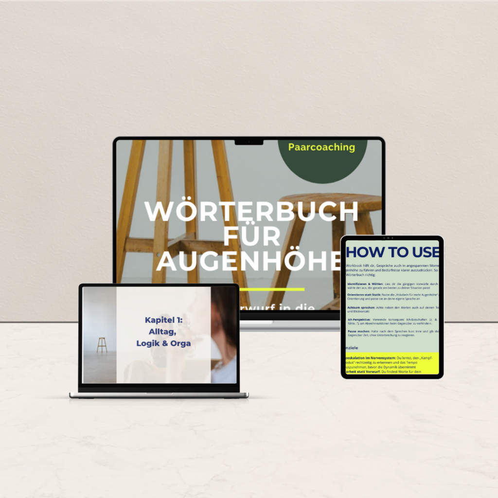 Hinter jedem Vorwurf steckt eine Sehnsucht. Wenn wir uns unverstanden fühlen, werden wir laut oder ziehen uns zurück. Mein Freebie unterstützt euch dabei, eure emotionalen Schutzreaktionen zu verstehen und durch eine neue, verbindende Sprache zu ersetzen. Ein kleiner Dolmetscher für euren Beziehungsalltag – direkt zum Download.
